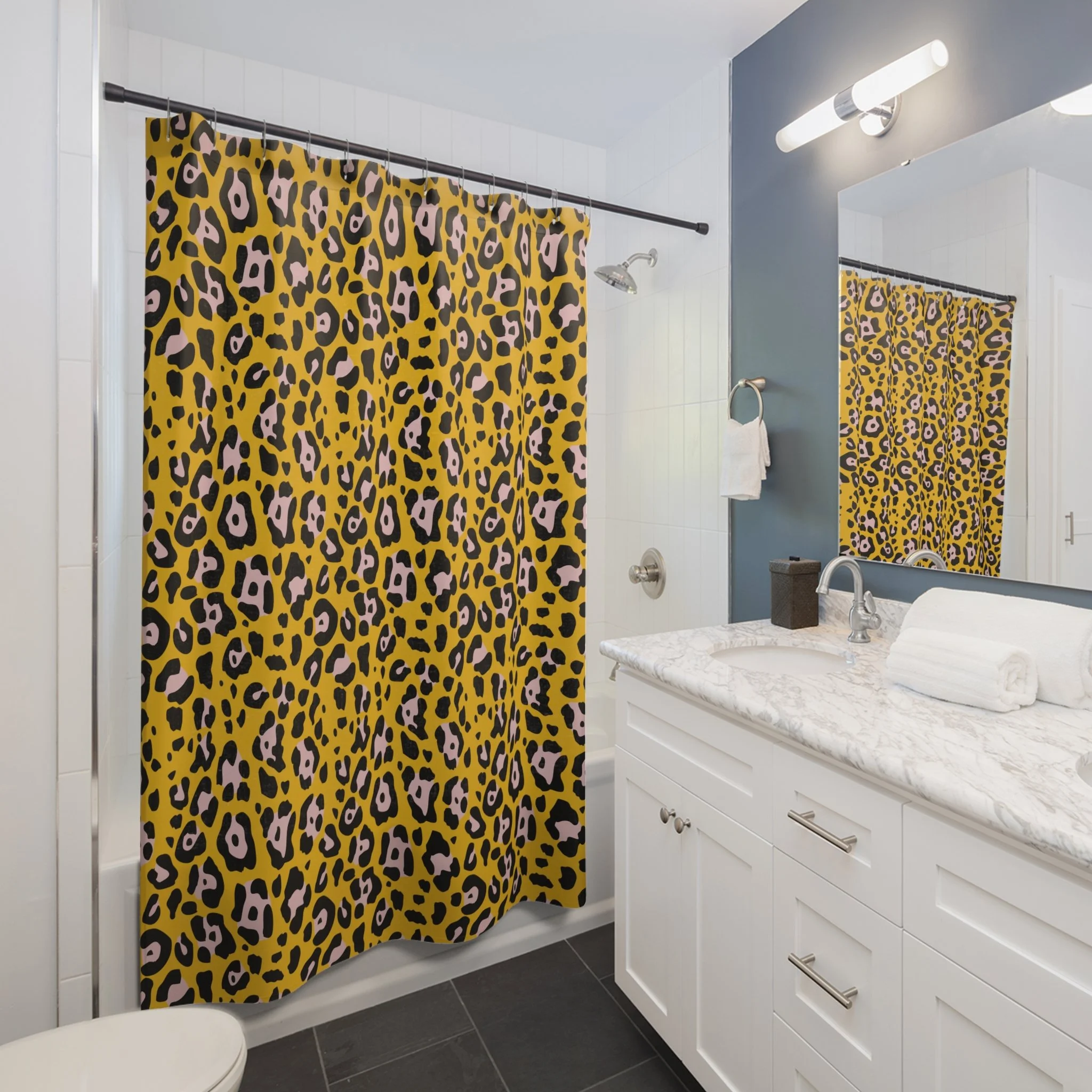 Transform your bathroom into a stylish sanctuary with this vibrant shower curtain. Featuring a striking leopard print design, it adds a touch of wild elegance that instantly elevates your space. Made from durable, quick-drying polyester, it’s not just a functional item, but a statement piece that sparks joy and creativity every time you step in. Perfect for those who appreciate bold aesthetics, this shower curtain is ideal for modern homes, apartments, or anyone looking to refresh their décor. Great for housewarming gifts, birthdays, or any occasion that calls for a little flair in the bathroom! Product features - 100% durable polyester material - Stylish one-sided print for a bold look - 12 easy-to-use buttonholes for hooks - Perfect for adult bathrooms - Size variance of +/- 2" for a custom fit Care instructions - Wash the item only cold machine wash with similar colors garments using a gentle cycle. Tumble dry on low settings or hang dry. Do not bleach or dry clean.